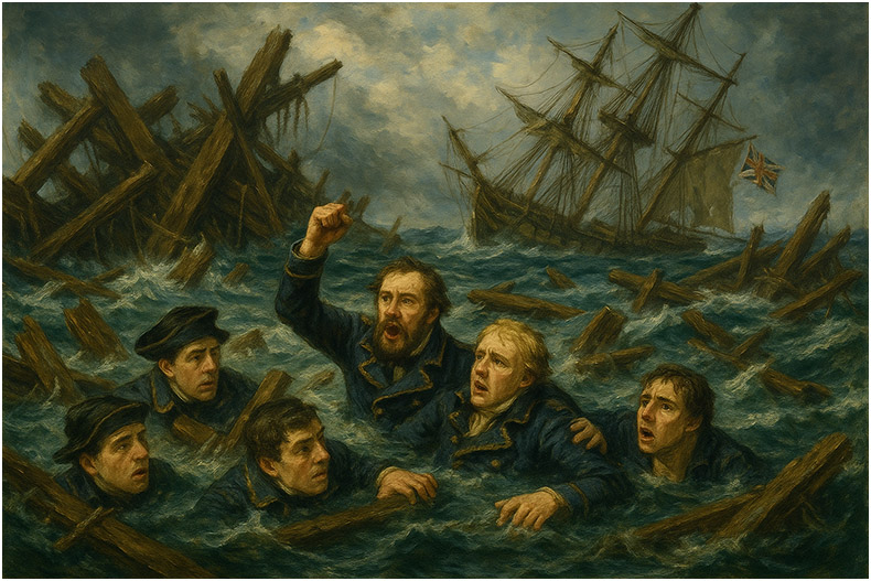 The ship rolled once more. A great grinding crash echoed through her bones. Her lower gun ports disappeared beneath the sea. The stern dipped, dipped again—and in moments, she was gone.