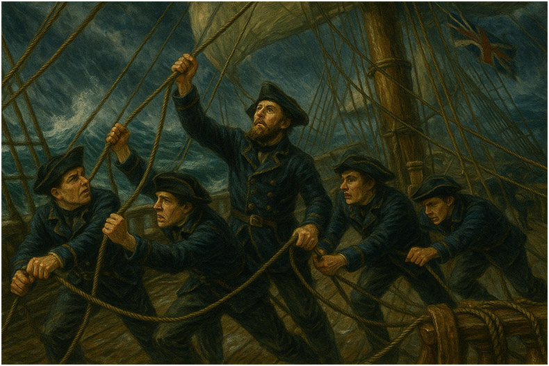 She was no young frigate galloping before a trade wind. No—Victory was an old campaigner, built with the generous timbers of an age nearly past. Her beams groaned as she climbed and fell among the mountainous seas, and yet she carried herself with that peculiar majesty that only a true ship of the line may possess. Her ensign, tattered though it was, yet flew defiantly from the mizzen, and the golden scroll of her nameplate gleamed wetly in the dim light.