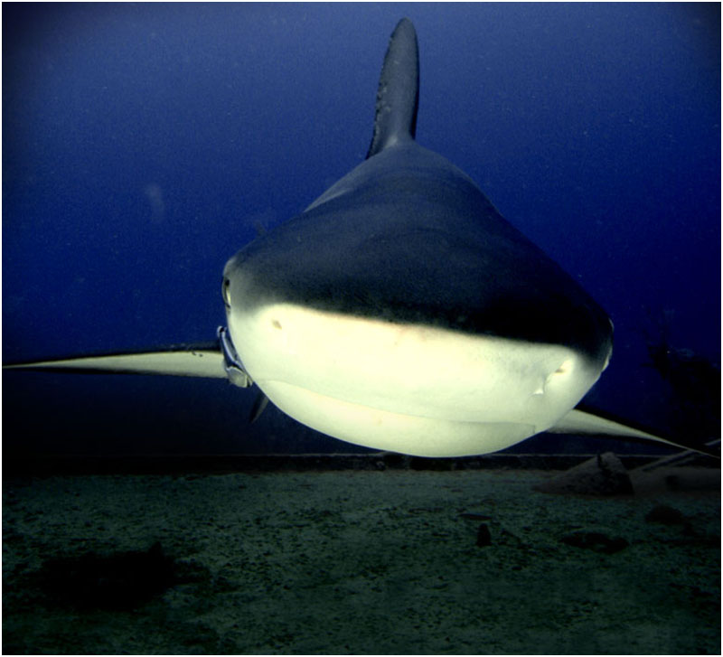 Cristina is clearly in charge as she and photographer Eddy Raphael descend to the staging area with Michael. They carry a specially designed tube containing the small fish that will be shark lunch today. This is a delicate time in the shark feeding course because if a diver is going to panic, this is when it is likely to happen.