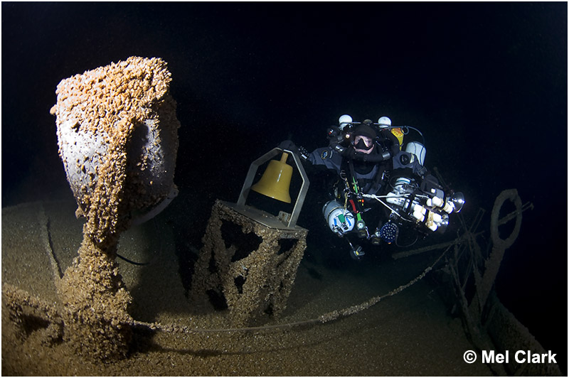 Above and below: CCR diver Curt McNamee poses beside the new ships bell. |
