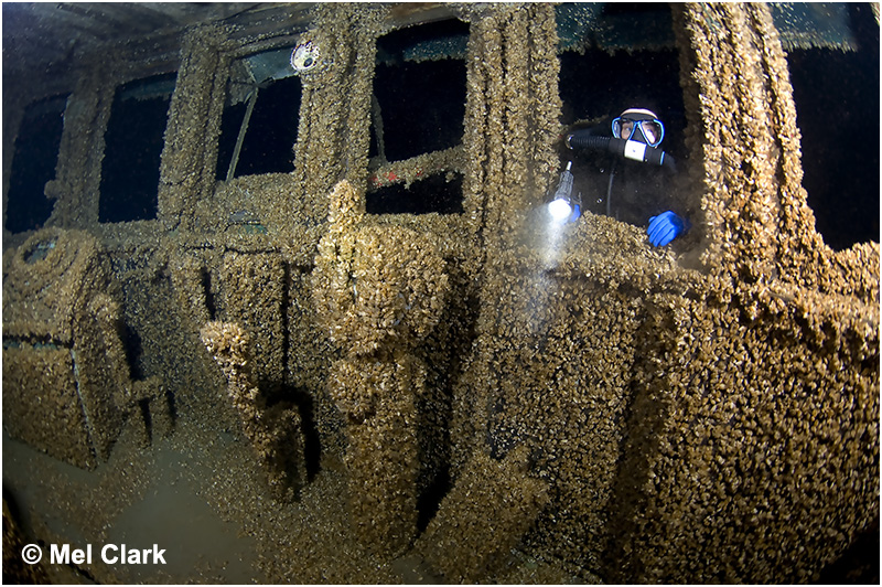 We met our boat Captains Jitka Hanakova, Ron Benson and first mate Lubo Valuch in Manistique Michigan and headed out to the wreck. Erik Foreman, Curt McNamee, Tom Kean and I would be the first team in. Captain Jitka and Ron would be our surface support and safety divers for today’s dive. The mooring line is attached to the port side superstructure behind the bridge and right before the loading crane. We stop to check the mooring line’s integrity before we started out to our targets. The first stop was the ships bell and spotlight. This wreck is now encrusted with zebra muscles. When diving the Carl Bradley keep this in mind as visibility for your pictures or video can be quickly destroyed by a poorly placed fin kick. The ships bell was removed in 2007 by divers and replaced by an honorary bell with the 33 sailors names that were lost that day. The new bell has no zebra mussels on it and looks a bit out of place. On top of the bridge along with the bell you will see a huge spotlight and a radio communication antenna. On each side of the bridge roof section is a wooden plaque with the ships name on it. The names use to be legible but are now completely obscured by zebra muscles. Under the name you can still make out the words pilothouse.