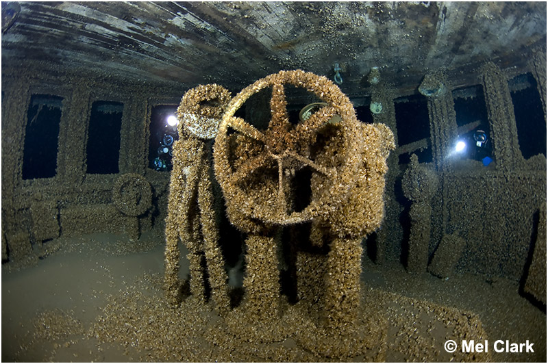 I was able to shimmy my way sideways into the pilot house. This was one of my most thrilling experiences mainly due to the fact that I was packed inside a tiny space at 310 FFW. I knew if I got stuck that my time and life would be in grave danger. Also I knew not many (if any) people had been inside this pilothouse since she sank and this added to my excitement, it’s great to be small at times. Everything was in place just as it was left that stormy night. I quickly moved around the circumference of the bridge imaging everything in sight.