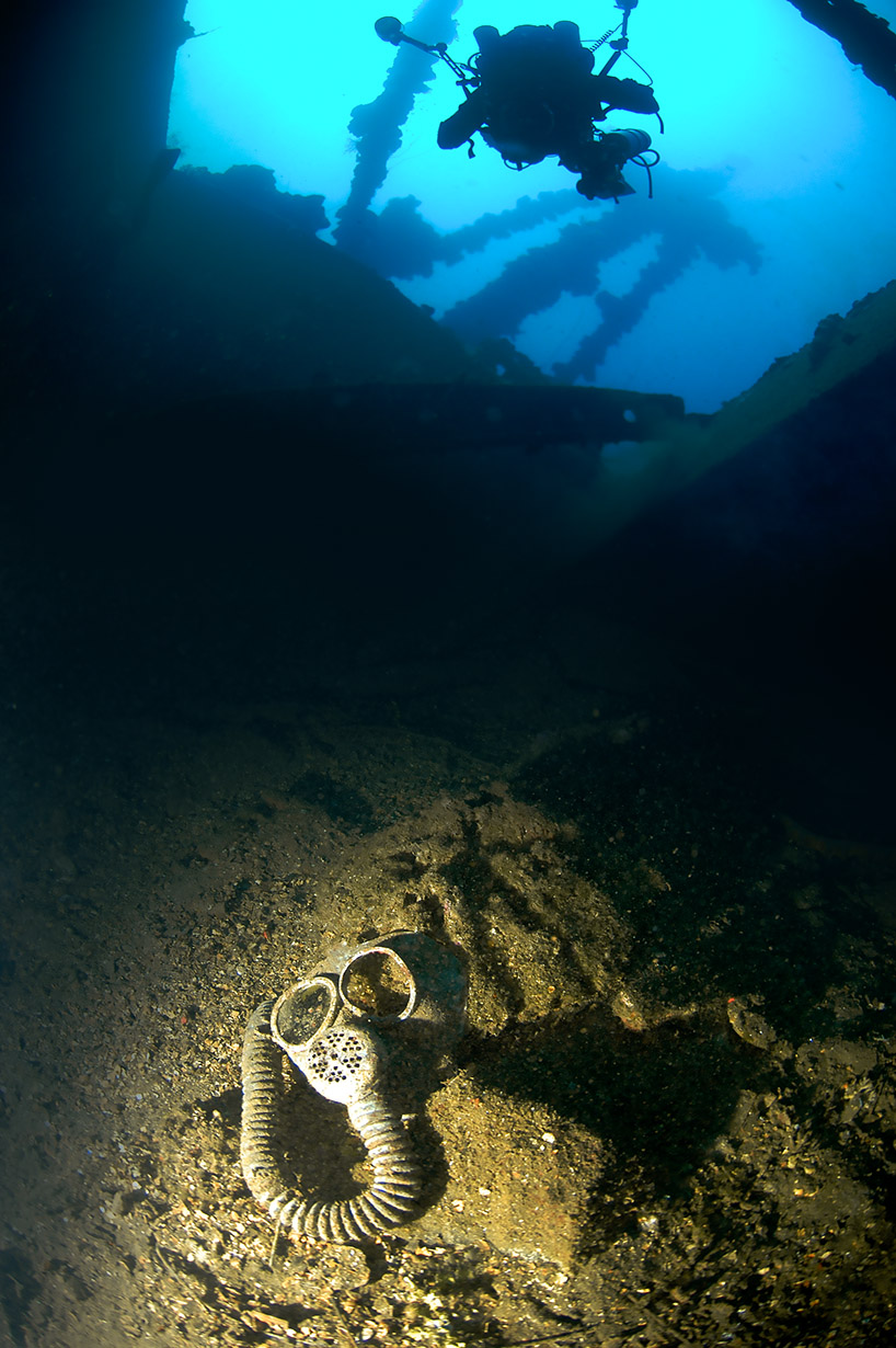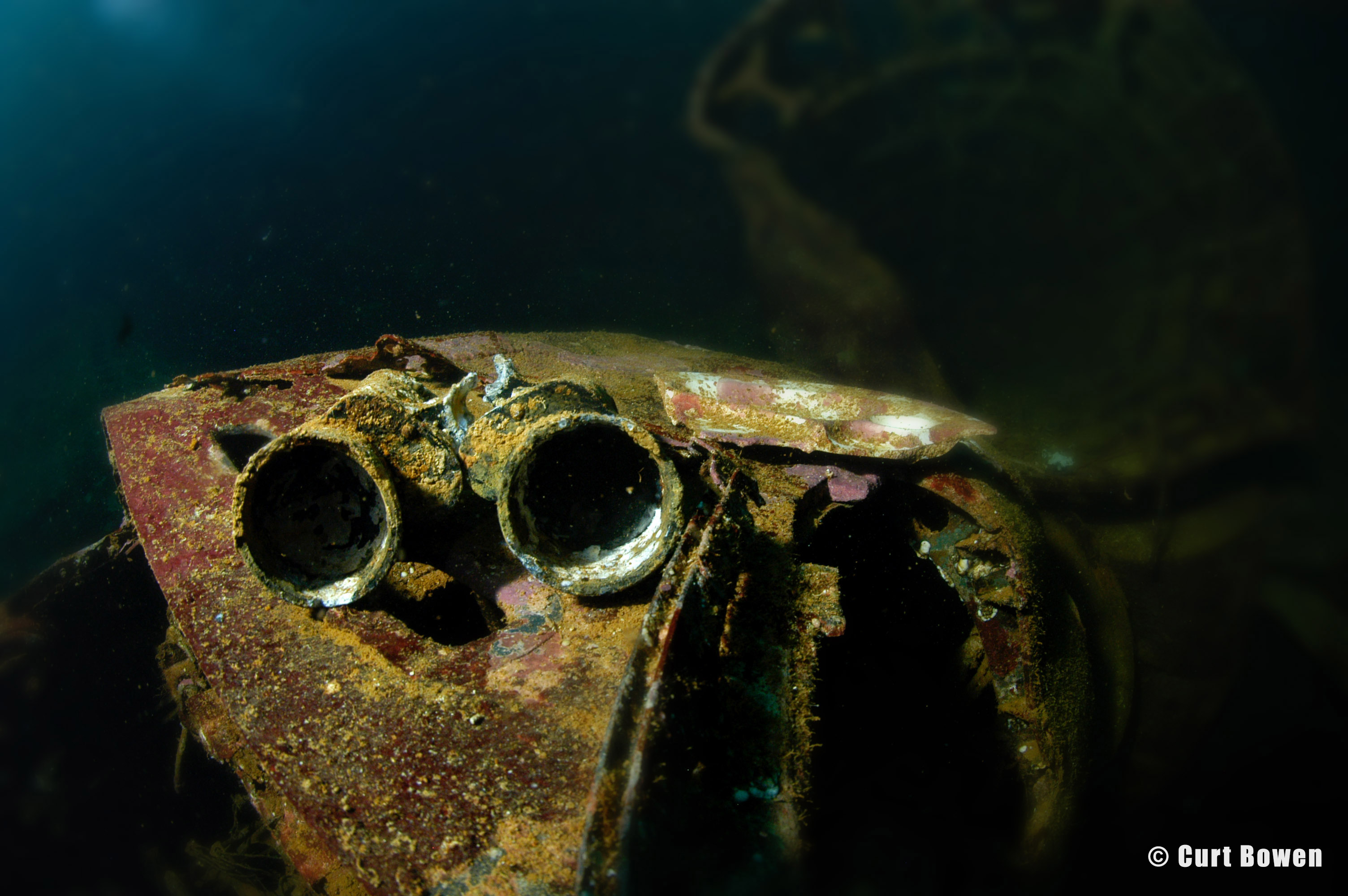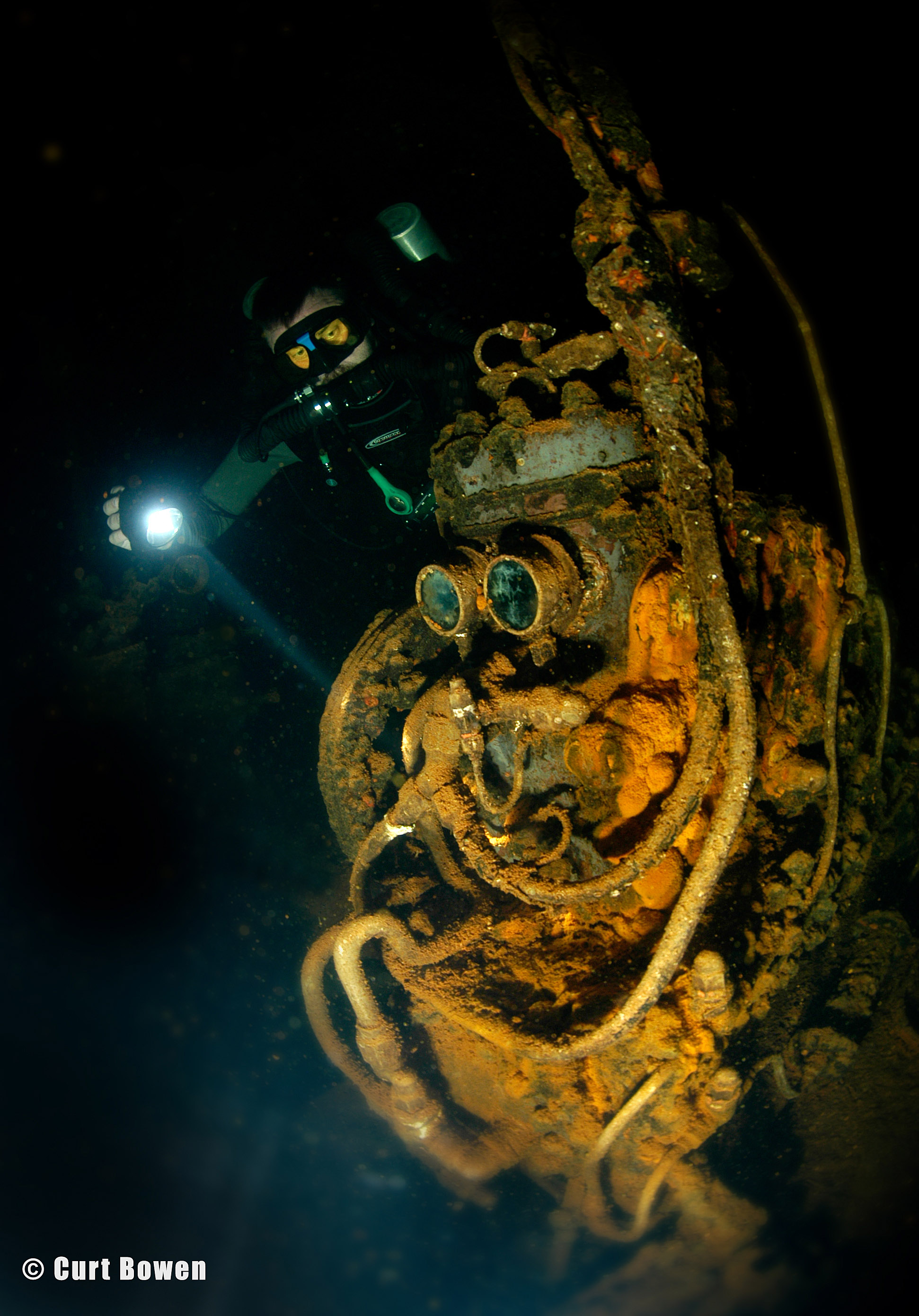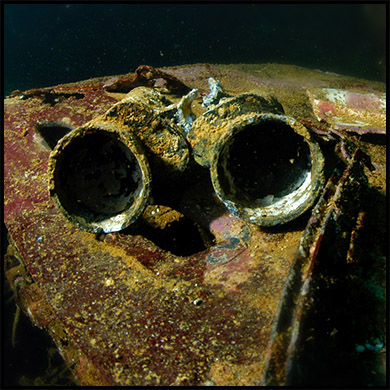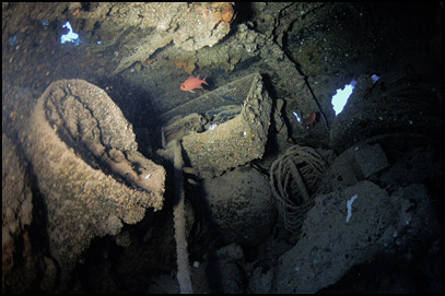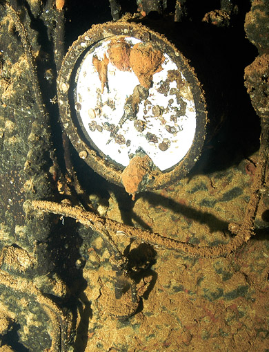 Exploring in the masses of twisted metal below the pilothouse, crews quarters and partially collapsed engine room some gauges, machinery and human remains can be located. (left photo)