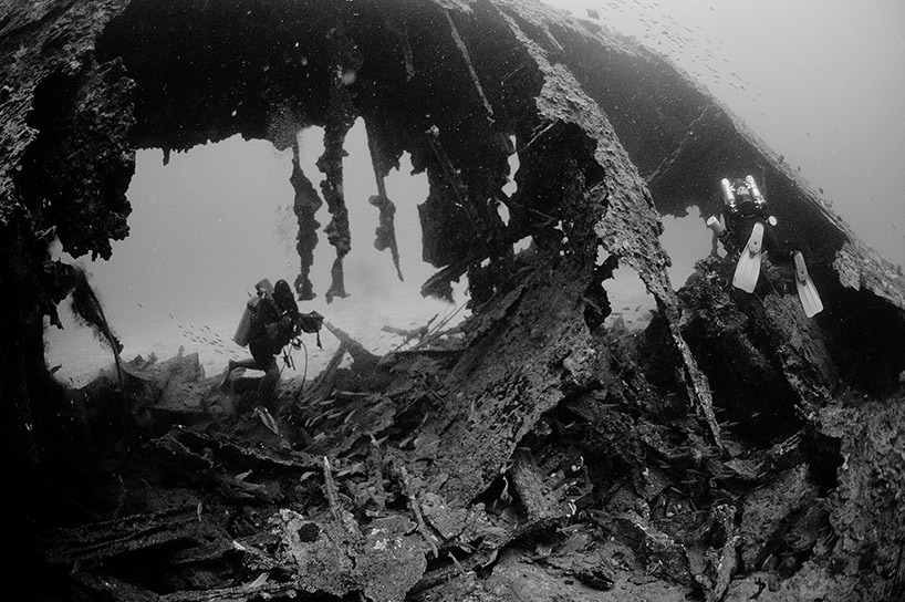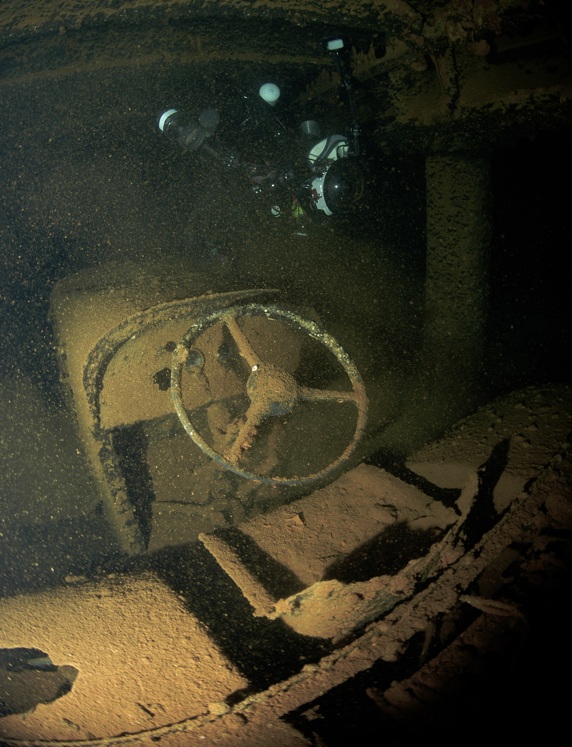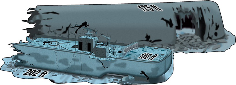 Above: CCR divers inspect the stern section of the Oite. Max depth 202 feet.