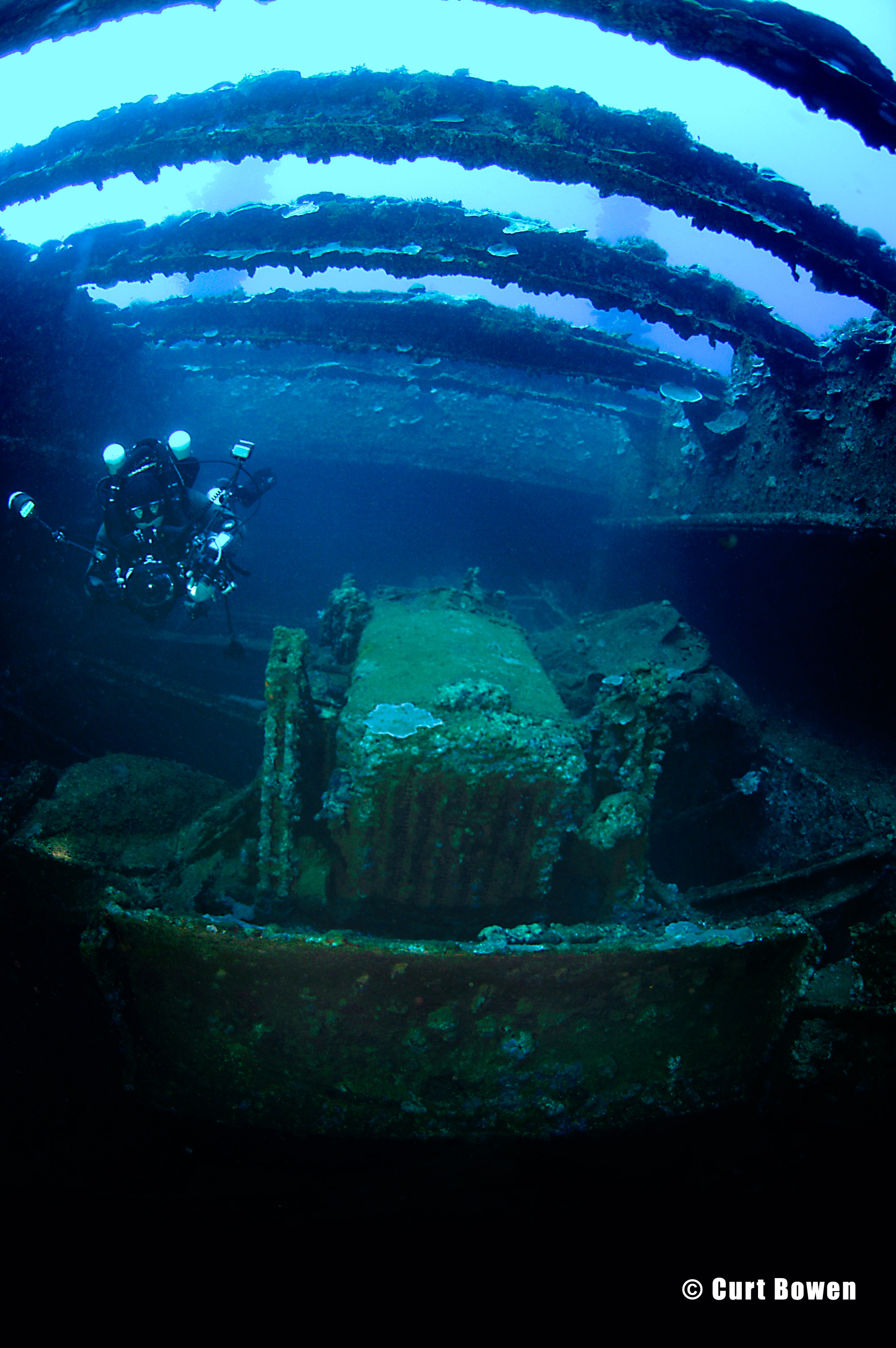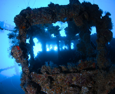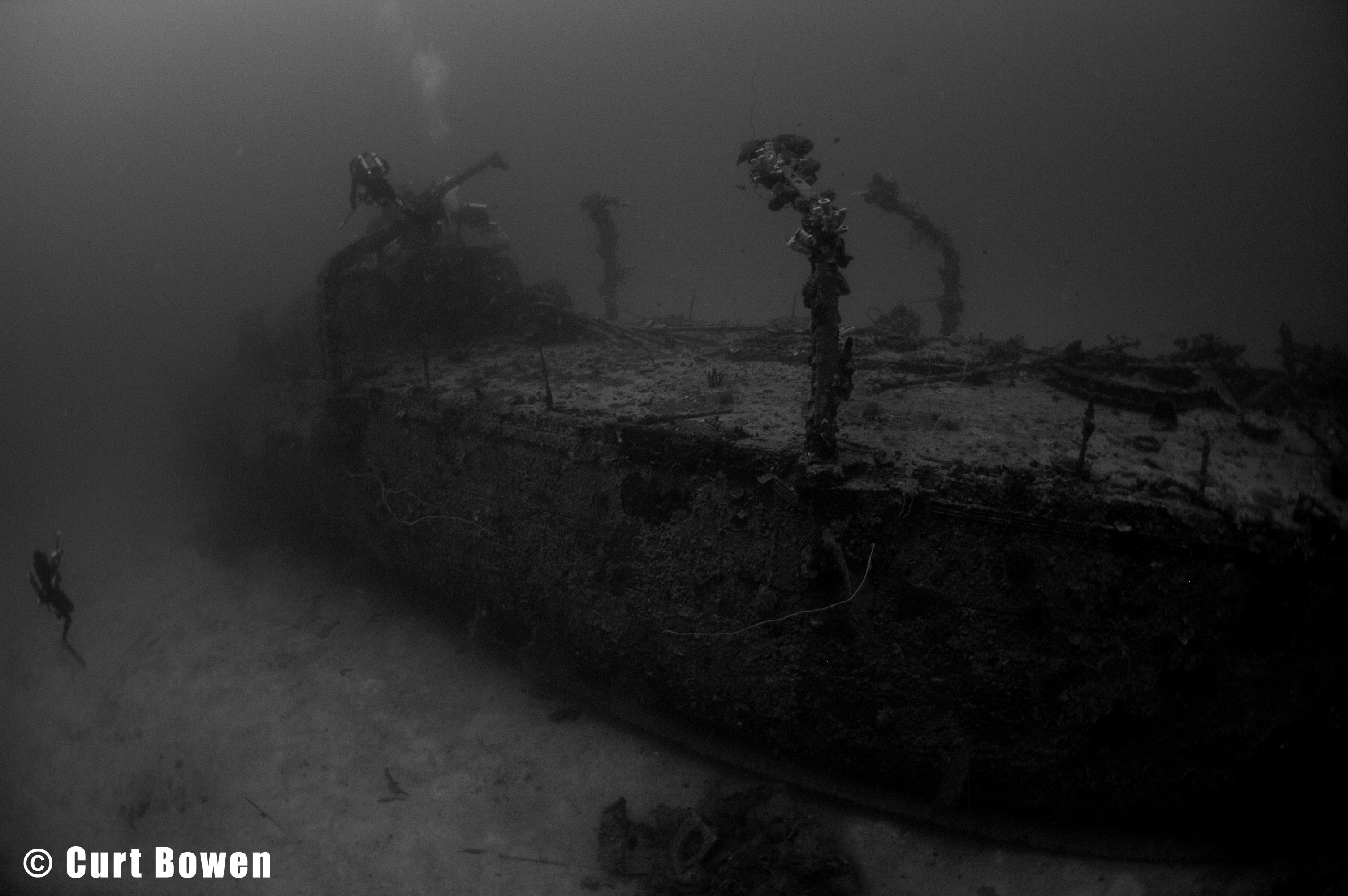 Exiting the cargo hold and swimming towards the stern you will pass the upper super structure and over the engine room.