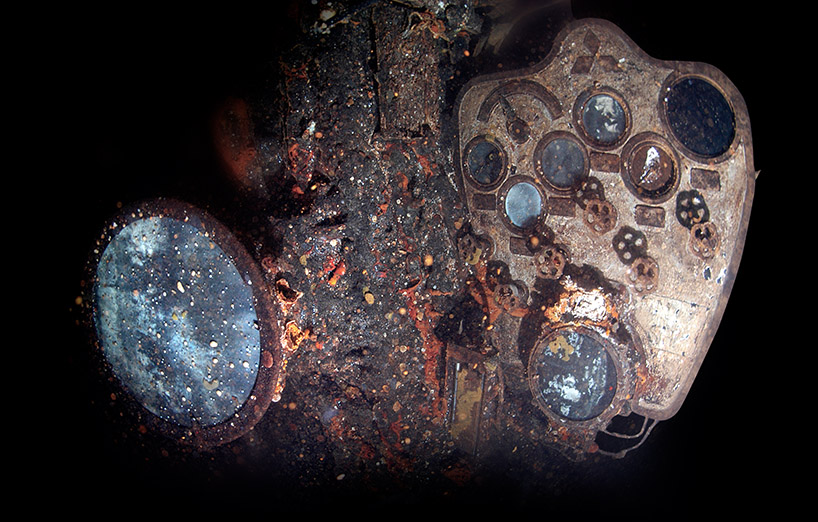 Above: Exploring deep into the third engine room level of the Heian Maru, CCR diver Ron Benson discovers this engine room telegraph and engine pressure gauge panel.
