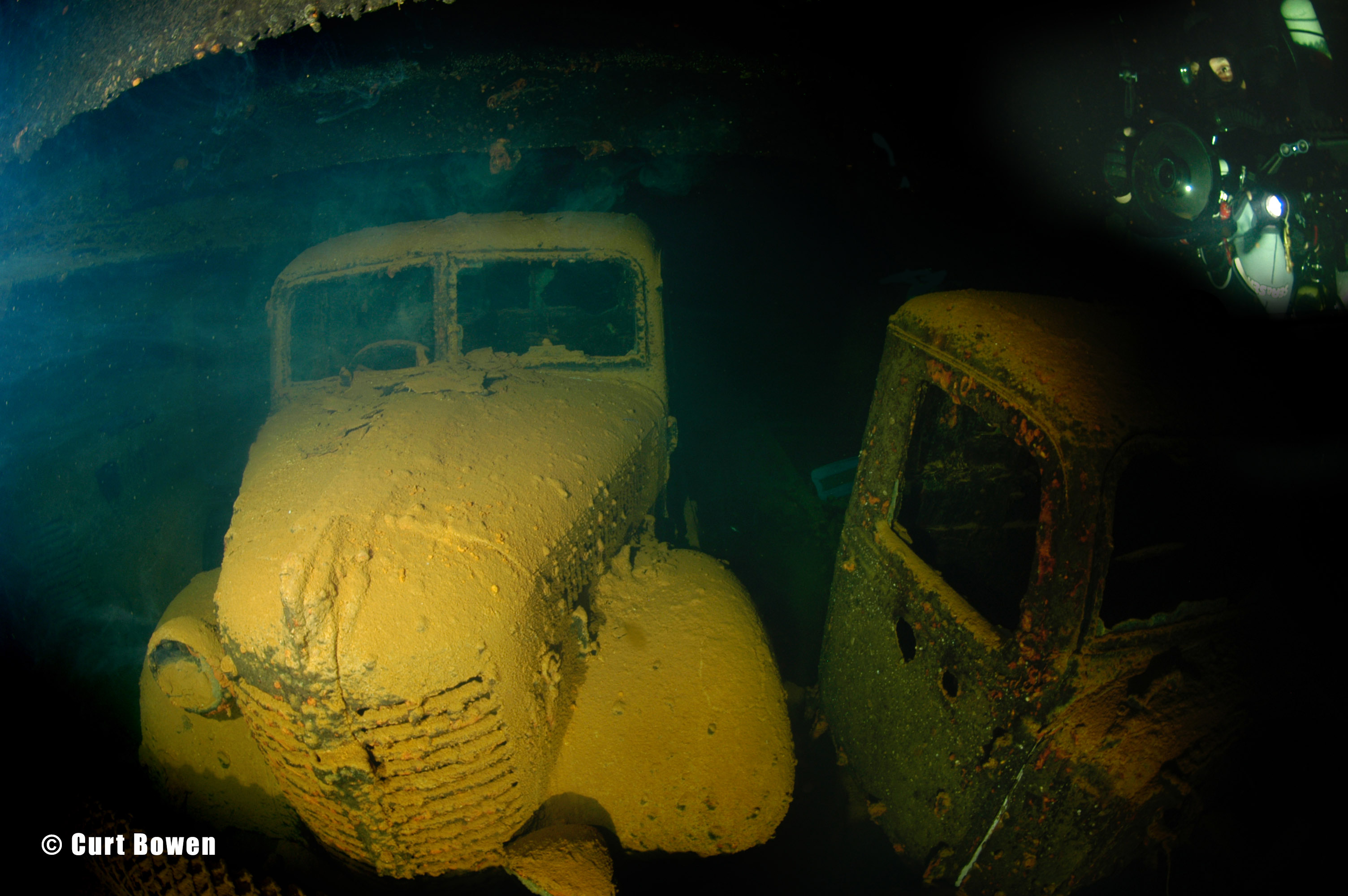 Above: CCR diver Jim Rozzi examines the large bulldozer in cargo hold # 5.