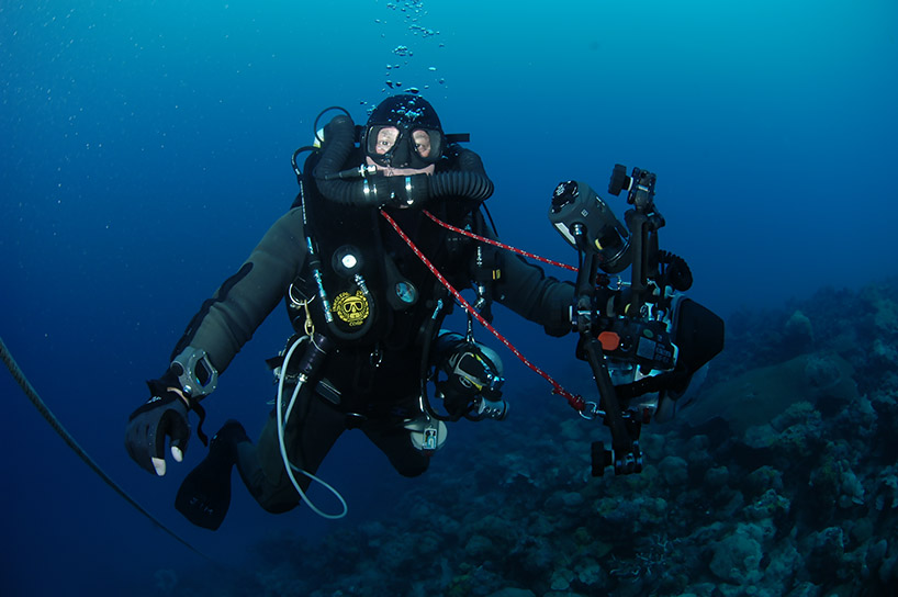 Below: Meg CCR diver Jim Rozzi and underwater camera set-up. |