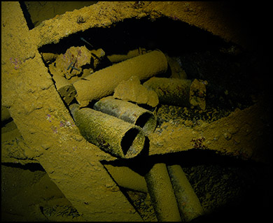 Below: Scattered throughout cargo hold #5, these 14-inch diameter artillery shells were destined for one of the large Japanese battleships, Yamato or Musashi. |