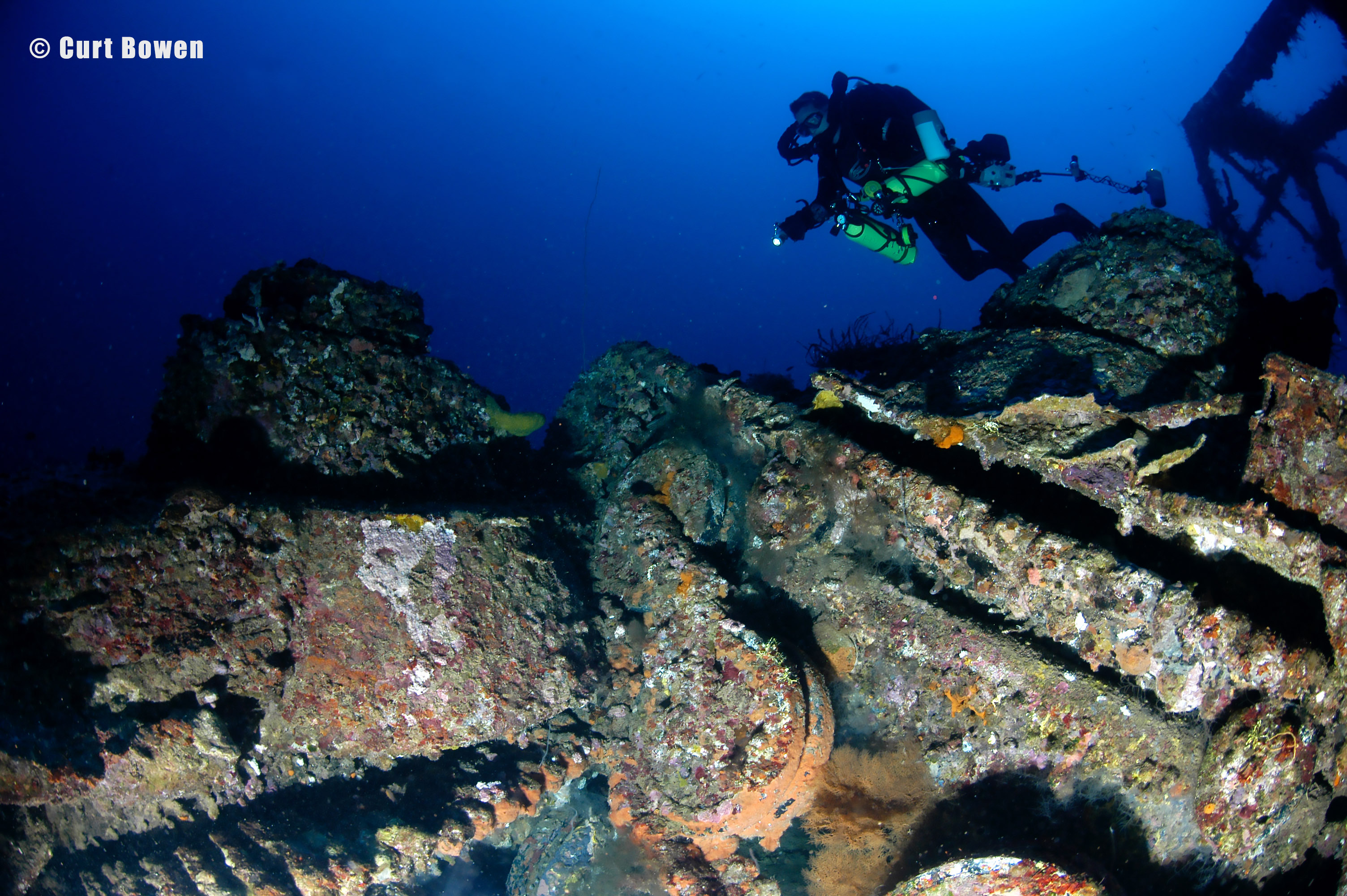 Cover Photo (TOP): Closed circuit rebreather diver Jim Rozzi explores the bow deck artillery on the San Francisco Maru.