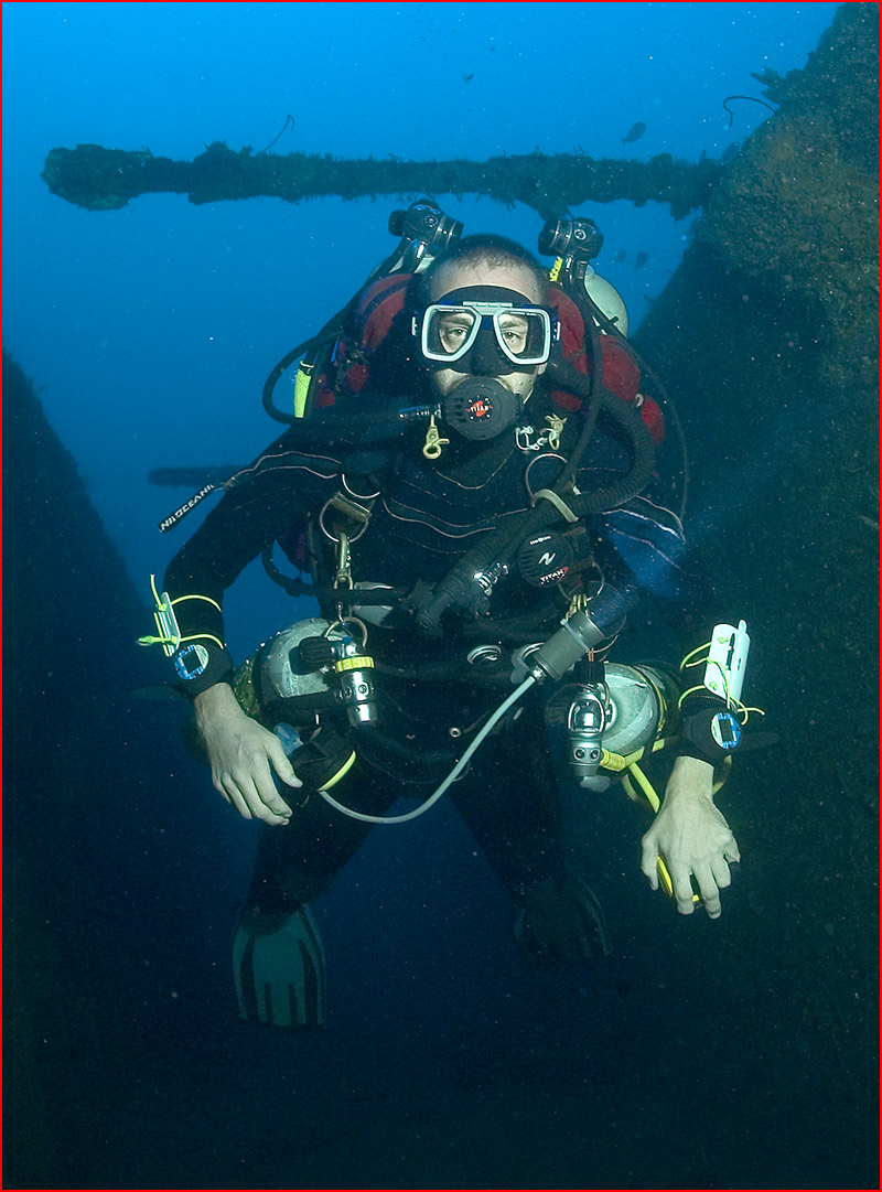 Barry Holland at Aquamarine has become an invaluable partner in my quest to explore and photograph the stern area of this massive ship. Barry is a TDI trimix instructor and has done thousands of dives on the wreck. Aside from the legendary Alan Power, Barry knows the ship as well as anyone. His passion for technical diving makes him the logical choice for any visitors who wish to dive beyond recreational air limits. Barry and I have a small cache of helium in Luganville, which goes a long way in the two-liter diluent tank on the KISS.