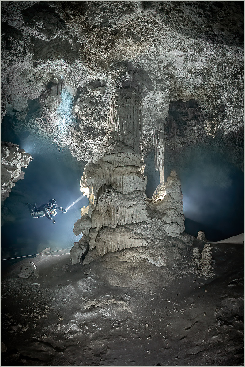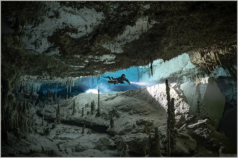 My first cenote dive was at Dos Ojos, and the moment I dropped below the surface, my life changed. A clear, blue tunnel twisted off into the distance. Sparkling white sand covered the floor of the cavern, thin, delicate stalactites adorned the ceiling, and massive columns rose like trees around me. Almost out of sight, I saw two cave divers in doubles swimming off into a dark hole. What was around that corner? Where were they going? I needed to know.