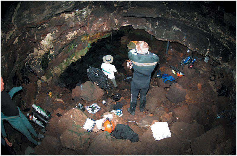 The cave system associated with Atlantida Tunnel formed a mere three to four thousand years ago during the great eruptions of the Corona Volcano. A massive explosion carpeted lava down the slopes of the mountain. As the surface of the lava cooled and solidified, a thundering torrent of molten magma continued to pour through the core of the flow - a virtual subterranean fire hose of lava. Meeting the ocean, a massive explosion vaporized seawater in its path as the hot tributary plunged below the surface. The final result was a tunnel almost four miles long that extends from the base of the volcano, down the side of the island to the coastline, before continuing an additional mile under the sea floor. From its vast size, unparalleled grandeur and enduring mysteries, it is easy to see why this final submarine section of the lava tube became known as the tunnel to Atlantis.