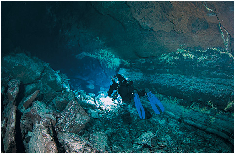 Accustomed to diving in limestone caves formed over hundreds of thousands of years, I was now diving in a cave that was formed in an instant! The contrast is sobering. Dripping formations were born from molten rock. Scours from rapidly flowing lava etched the walls in distinct layers. In places, undulating lava waves peeled off the wall, frozen in time.
