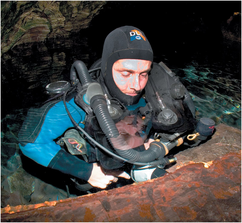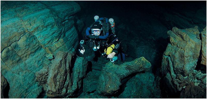 Below: Dr. Tom Iliffe dives a Megalodon rebreather as a matter of conservation, leaving athe water chemistry minimally affected by our presence.