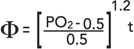 The CNS data in Table 1 is easily fitted to a dose time curve, using least squares, yielding, or, equivalently, in the same units, that is pO2 and tχ in atm and min respectively. The last column tabulates a pulmonary exposure dose, Υ, for divers, called the oxygen tolerance unit (OTU), developed by Lambertsen and coworkers at the University of Pennsylvania. Formally, the oxygen tolerance, Υ, is given by, and can be cumulatively applied to diving exposures according to the following prescriptions |