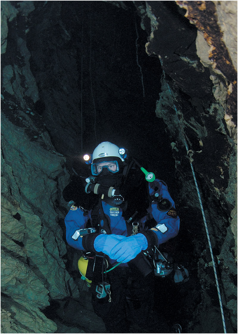 Initially, my dive was very enjoyable and relaxing. As I passed 23m, my vision seemed to flex, as though rivulets of water were running down my mask. I grabbed the shot line to stop my descent, and quickly clipped off one of the extra tanks. I knew that something was very wrong, and I needed to get out immediately. I couldn’t get rid of the other tank, I was too dizzy. After going up only a few metres, the whole shaft began to twist and spin violently. I had the line in my hand, but couldn’t tell which way was up. I felt myself being flung against the side of the shaft by vertigo. Grit and sand came away from the walls, and the visibility disappeared. It was as though something had taken hold and was throwing me about the cave, and that same thing was pressing blackness just behind my vision. I was terrified that I would pass out. I had managed to not lose the shot line, and somehow found myself at the top of it.