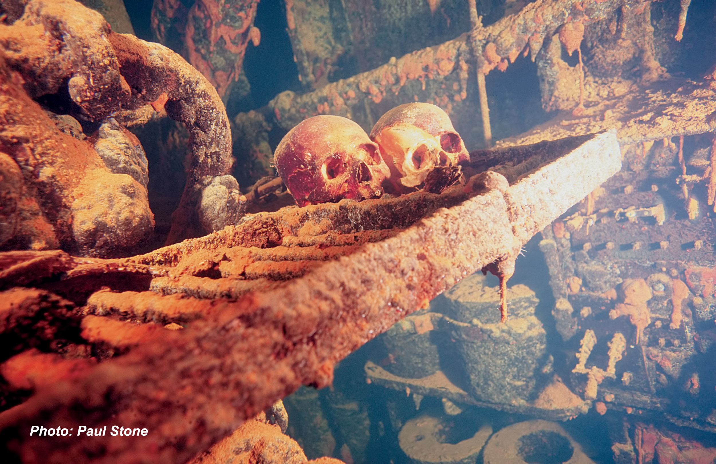 Above: Deep below deck in the far reaches of a ship’s hall ghostly human remains remind us of the consequences of war.