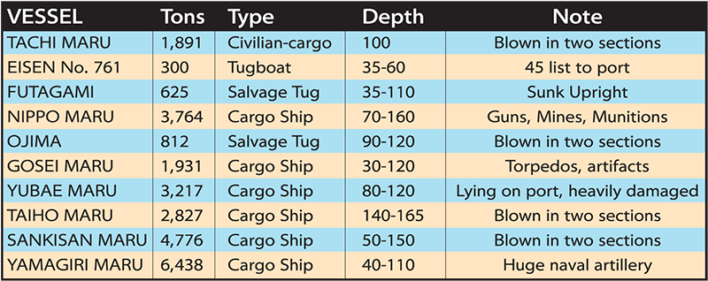 The geography of Truk made the perfect site for a naval base of the WW II era. The 40-mile diameter lagoon is encircled by shallow reef nearly 140 miles in circumference. At those distances, Japanese warships within the lagoon could stay outside the range of allied naval fire. The five navigable passes into the lagoon were strongly protected by artillery on flanking islands, and most were heavily mined. Navigation over the reef was impossible. Depths within the lagoon exceed 240 feet, providing plenty of mean water for ship and submarine navigation. Approximately 245 volcanic islands dot the lagoon, some with elevations in excess of 1500 feet. These islands were prime locations for airstrips, surface ship and submarine repair bases, troop barracks, bulk fuel storage, and radio communications. Most were heavily armed with antiaircraft weaponry.