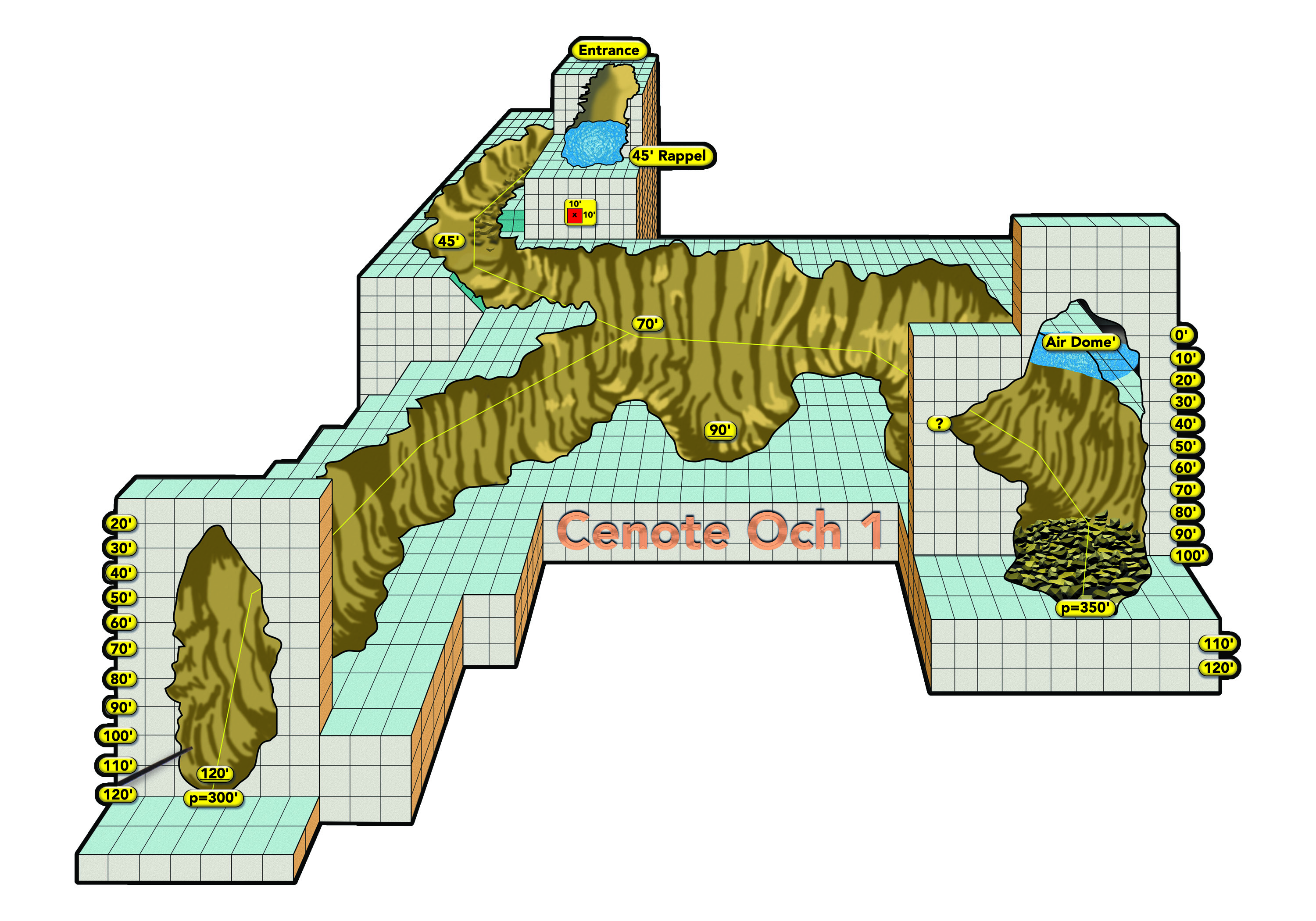 It contained a large air dome at its surface and dropped to a maximum depth of 123 feet. While gathering survey data on the way out of the cave, Bowen noticed another tunnel on his left. Attaching his survey reel to the primary line, he found that this tunnel continued through a large passage with a sloping floor until it came to a prompt end some 200 feet from the tie off. The team determined that future exploration of the site was needed to fully research and document the cenote.