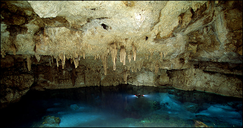 Above: Explorer Jon Bojar illuminates the large cavern zone of Cenote Tohoku.