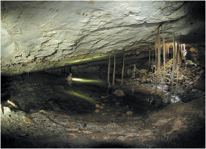 Above: A small opening in the jungle leads the team of explorers to a large underground room containing a shallow water pool. |