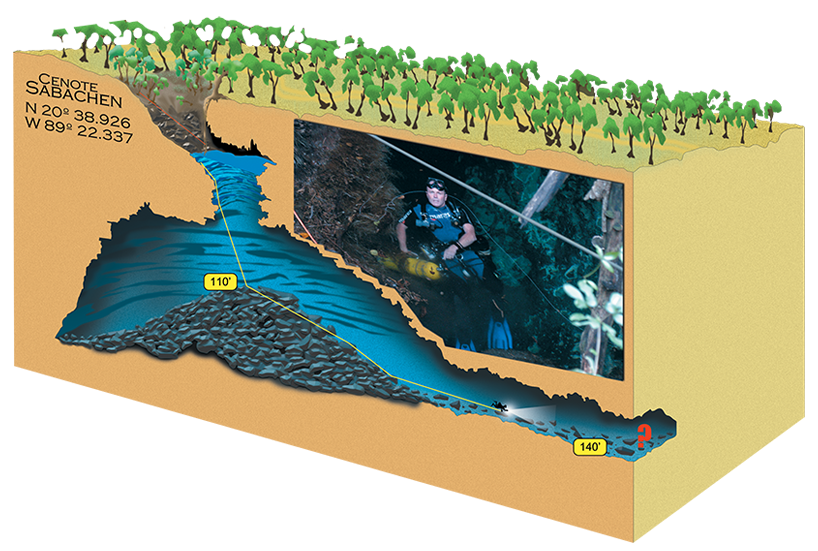Below: Artistic rendition of Cenote Sabachen. Explorer Rusty Farst reports that the cave continues with a 100-foot wide passage at a depth of 140 feet. Continued exploration required! |