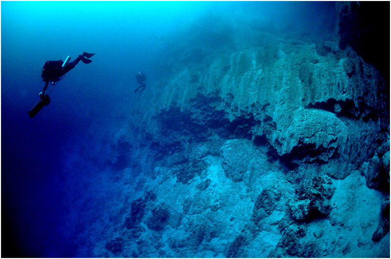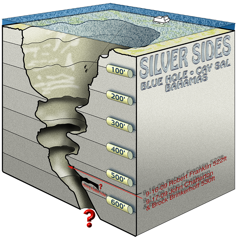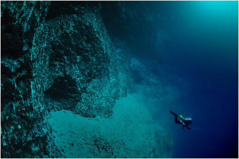 As we neared our agreed upon depth, we slowed to admire the wall and the next ledge below us. We knew we had reached our goal, and that our time here would be short. As we hovered in the darkness peering beyond the next ledge, all we could see was the blackness of a hole that went on. The mystery of the Cay Sal massive blue holes continues for yet another expedition.