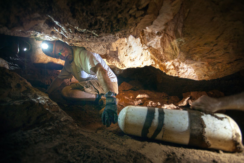 Diving exploration: Considering that two distinctly different types of caves were explored and investigated during the expedition, specialized techniques are required for each. Inland anchialine caves required side-mounted tanks that facilitate transport of tanks through dry caves and allowed divers to penetrate low profile restrictions. Search for ocean caves required boats for access and closed circuit, mixed gas rebreathers due to depths of 80 m or more. All divers participating in the project were highly experienced at these types of dives meeting recognized cave diving safety standards.