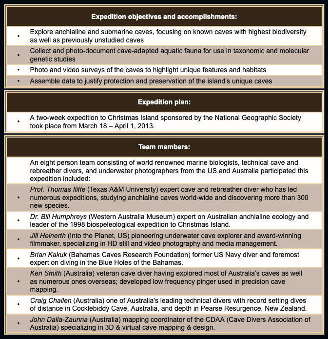 Results: We anticipate that several new species will be described as a result of this expedition. The geology (volcanic seamount capped with limestone), types of caves (dry limestone caves with anchialine pools in their interior), and geologic history (mid-ocean basaltic seamount of Cretaceous to Tertiary age) of Christmas Island in the Indian Ocean compares closely with that of Bermuda in the Atlantic. The rich anchialine fauna of Bermuda (>80 cave-adapted species) suggests that numerous additional discoveries await on Christmas Island. Considering that very little information exists on anchialine fauna from the Indian Ocean, our data should be of considerable biogeographic and evolutionary importance. Furthermore, our diving exploration of the underwater caves of Christmas Island provides significant data relevant to the mode and timing of cave formation in relation to sea level history and island uplift.