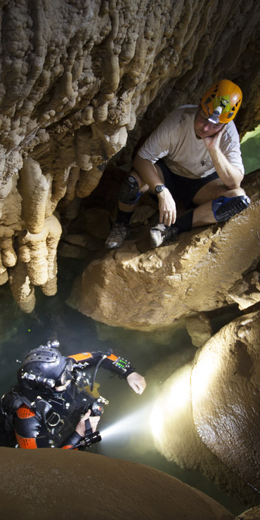 Left Photo: Checking his gear one last time Tom prepares for a dive in Runaway Cave. Underwater, the cave consists of massive boulders wedged between two bedrock walls – like diving through spaces between giant marbles in a goldfish bowl. |