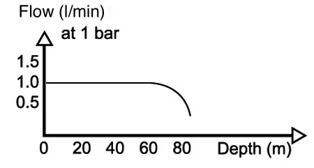 Suppose we choose the diameter of the orifice this way, that at surface, with the IP, or P1, set at 10 bars, we have a flow of 1 l/min (measured at the surface!!, so +/- 1.43 grams/min).