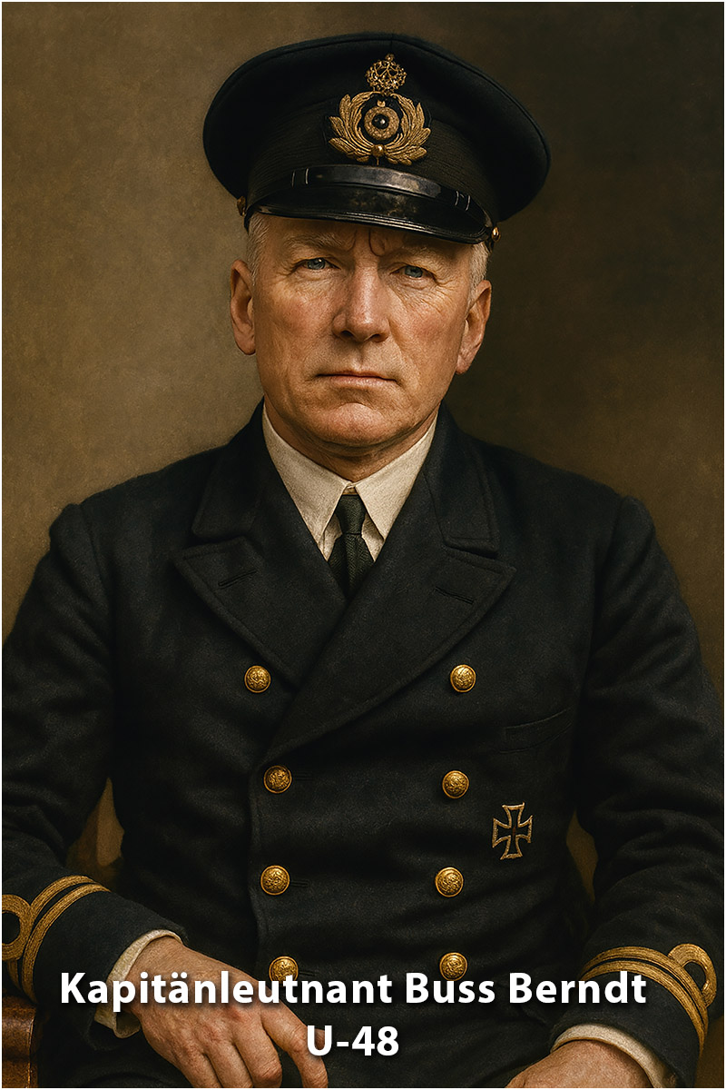 Under Buß’s command, U‑48 conducted eight war patrols, delivering a devastating blow to Allied and neutral maritime trade. His tally was formidable: 19 ships sunk (totaling 46,709 GRT), 1 damaged (180 GRT), and 2 taken as prizes (5,904 GRT).