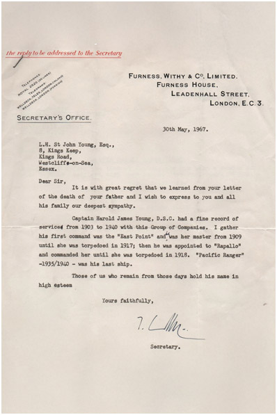 By 1909, Harold James Young had achieved command of the ss East Point, an 8,000-ton British merchant steamer managed by Simpson, Spence & Young. His career intersected with history repeatedly. In December 1915, during the Gallipoli campaign, the badly damaged East Point — under his command — secretly evacuated the 1st Scottish Horse directly from the Suvla firing line under Turkish observation. The operation, organised militarily by Major R. E. S. Barrington, was later recounted by Young in a letter from Alexandria to his sister-in-law.