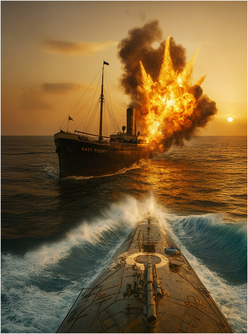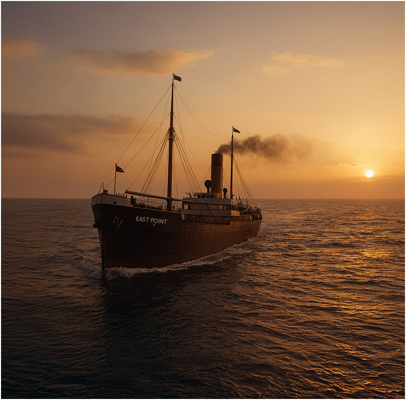 There she was — the East Point, a British tramp steamer with a black hull sitting deep in the water, her single funnel trailing thick coal smoke in the dying light. A plume of steam jetted from her whistle as she kept a steady course.