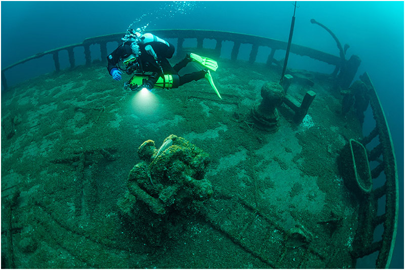 Experienced technical divers consider the wreck of the Eber Ward a premier dive site because of its depth and condition. Much of the ship’s structure remains intact, including its bow, stern, and a large section of the deckhouse. The ice crushed the bow, and divers can see the twisted metal, a silent reminder of the ship’s violent encounter.