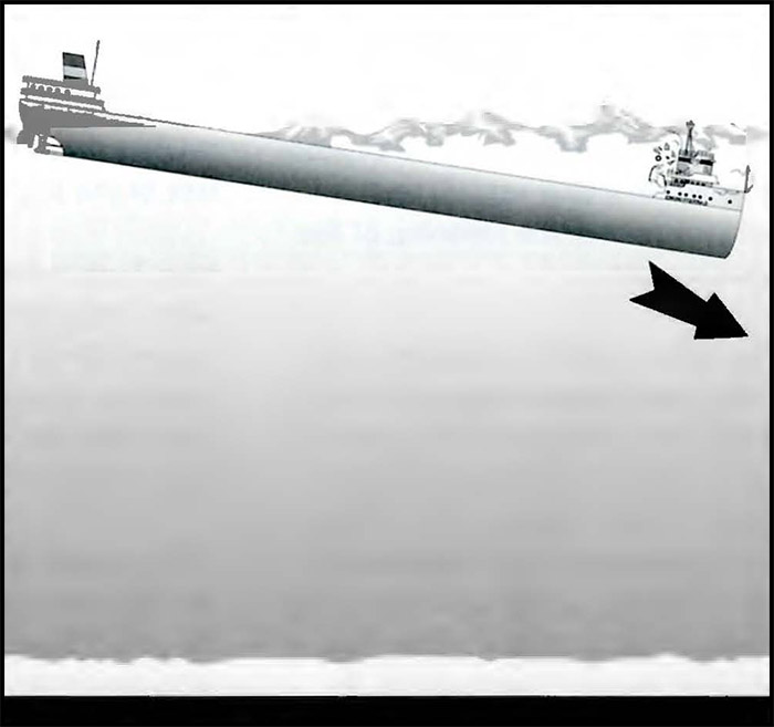 The Fitzgerald bit deeply into an especially huge wave. The bow was driven completely underwater. The weight of the flooding water, combined with the engines and forward momentum drove the vessel underwater like a torpedo. It is believed that the Fitzgerald sank in less than a minute.