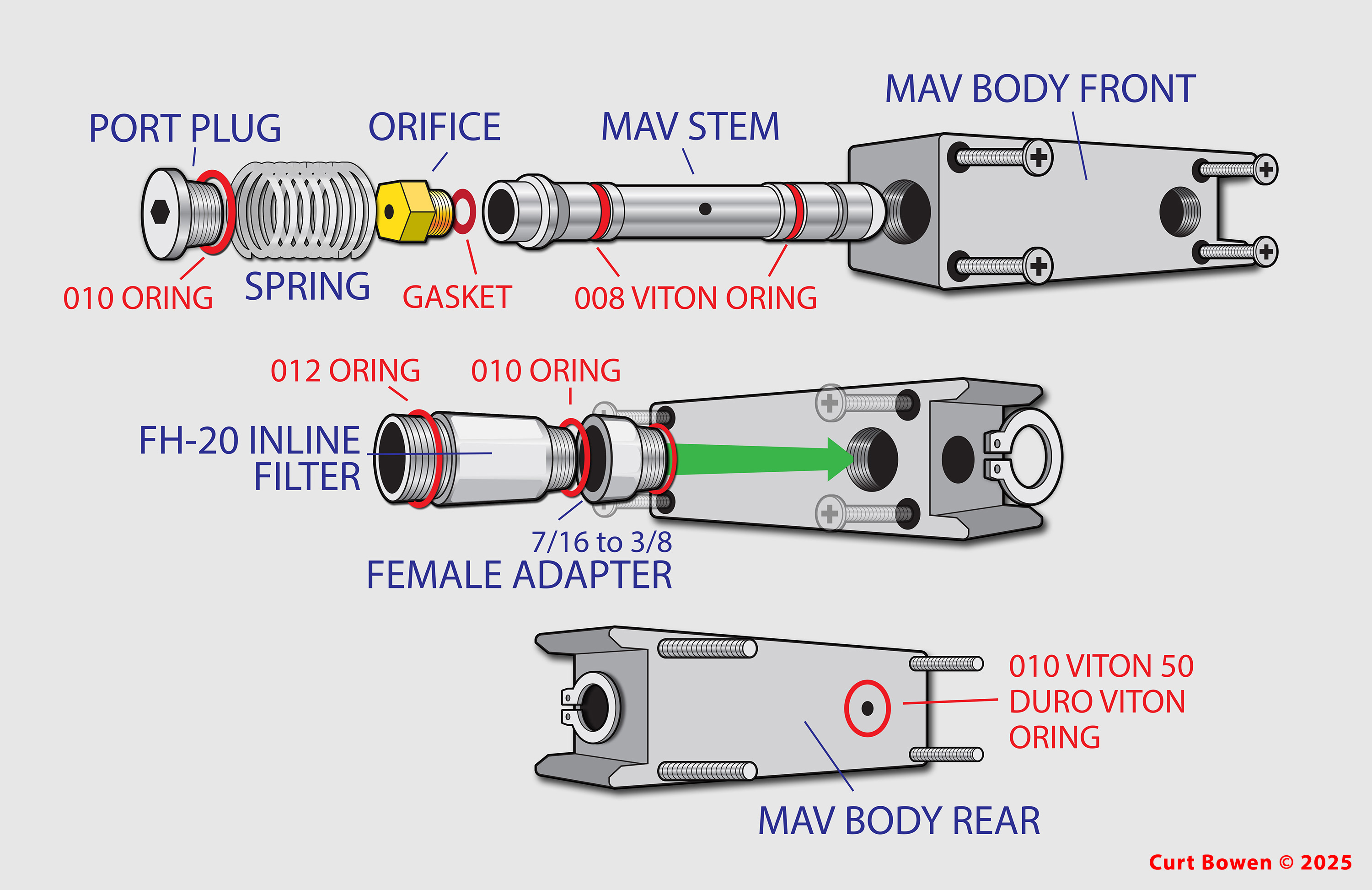 Inspect the inner barrel, and after cleaning it the O‐rings can now be replaced. 1 x #121 50 durometer, and 2 x # 127 70 durometer. Next, clean and lubricate the inside of DSV body. Finally, lubricate the outside of the barrel.