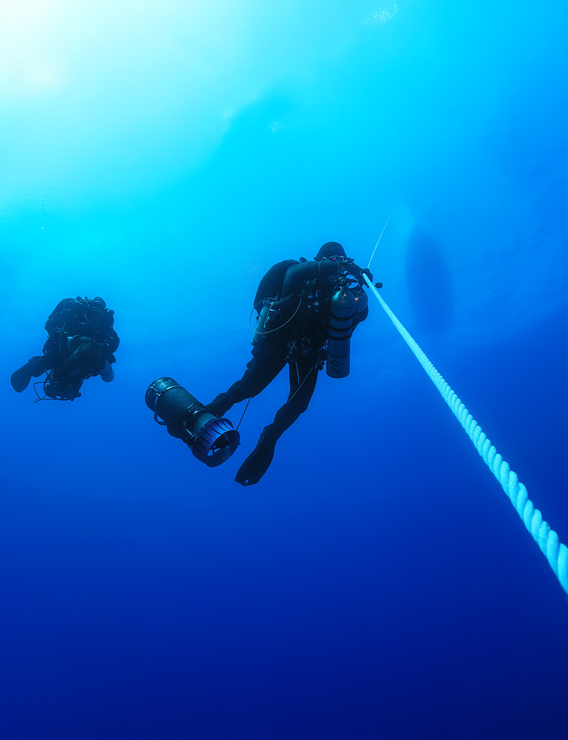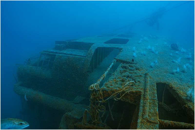 Railing still adorns the perimeter of the wreck. Swimming towards the stern, numerous hatches permit access to the interior. Divers can follow rows of portholes aft until eventually encountering the large single screw on the terminus of the sloping hull. Crossing back over to the upper decks, machinery and booms provide a unique scene near the fantail, while large hawser lines float 50 feet upwards from the wreck. These lines used to float on the surface for several years, which helped to expedite the location of the wreck.