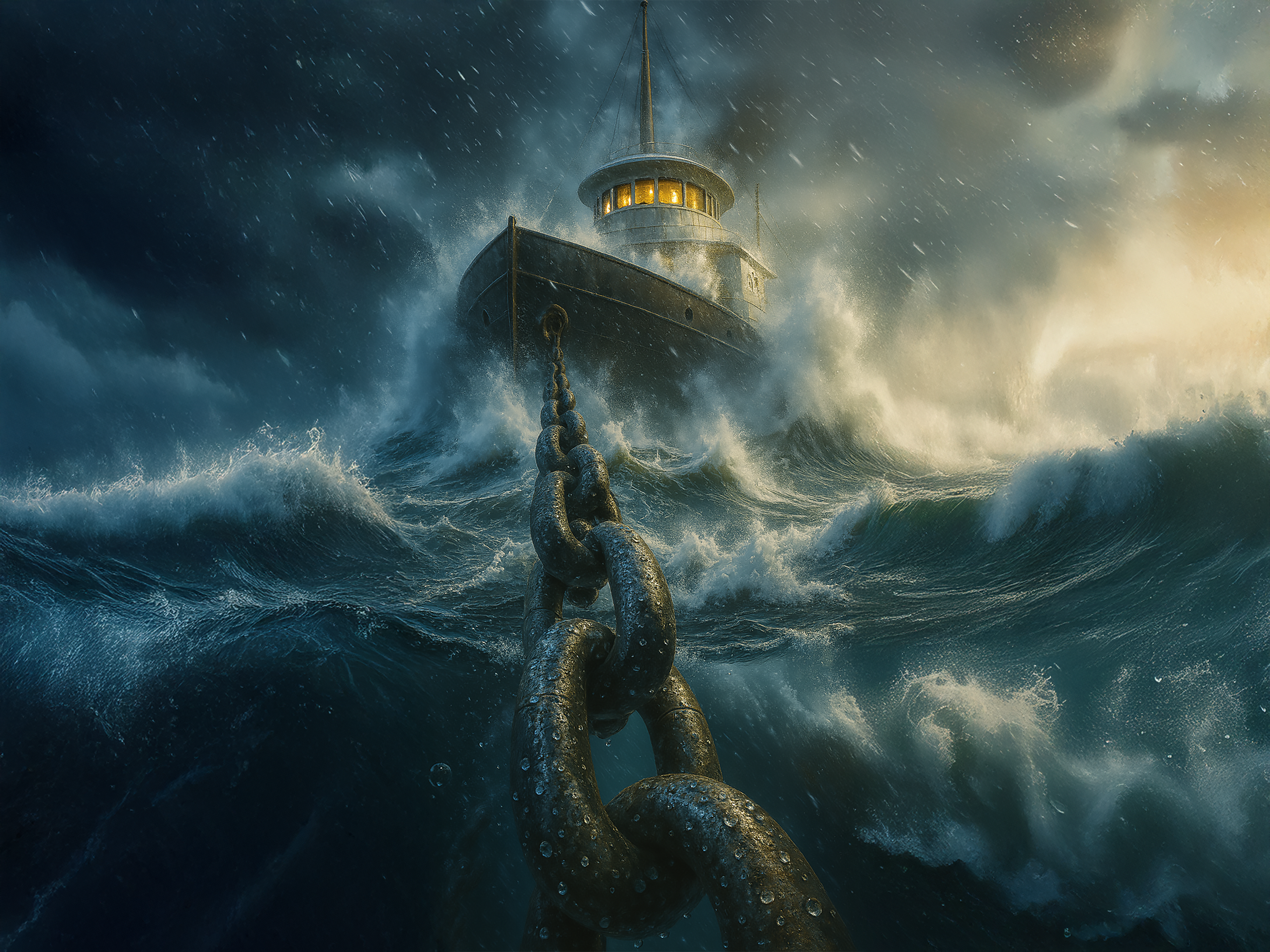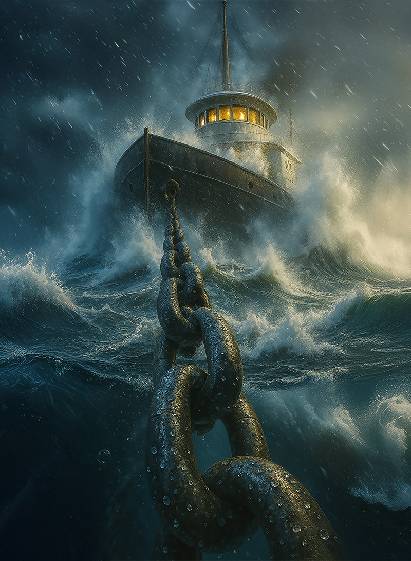 Above: The massive anchor of the James C. Carruthers claws deep into the lake floor, straining to hold her bow steady against screaming 100-mile-per-hour winds and towering 30-foot walls of water, as the storm rages with unrelenting fury. ( Click to enlarge ) Ill. C. Bowen