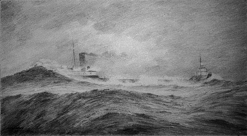 Above: Pencil drawing by maritime artist Robert McGreevy of the James Carruthers heading downbound with heavy seas crashing on the stern.