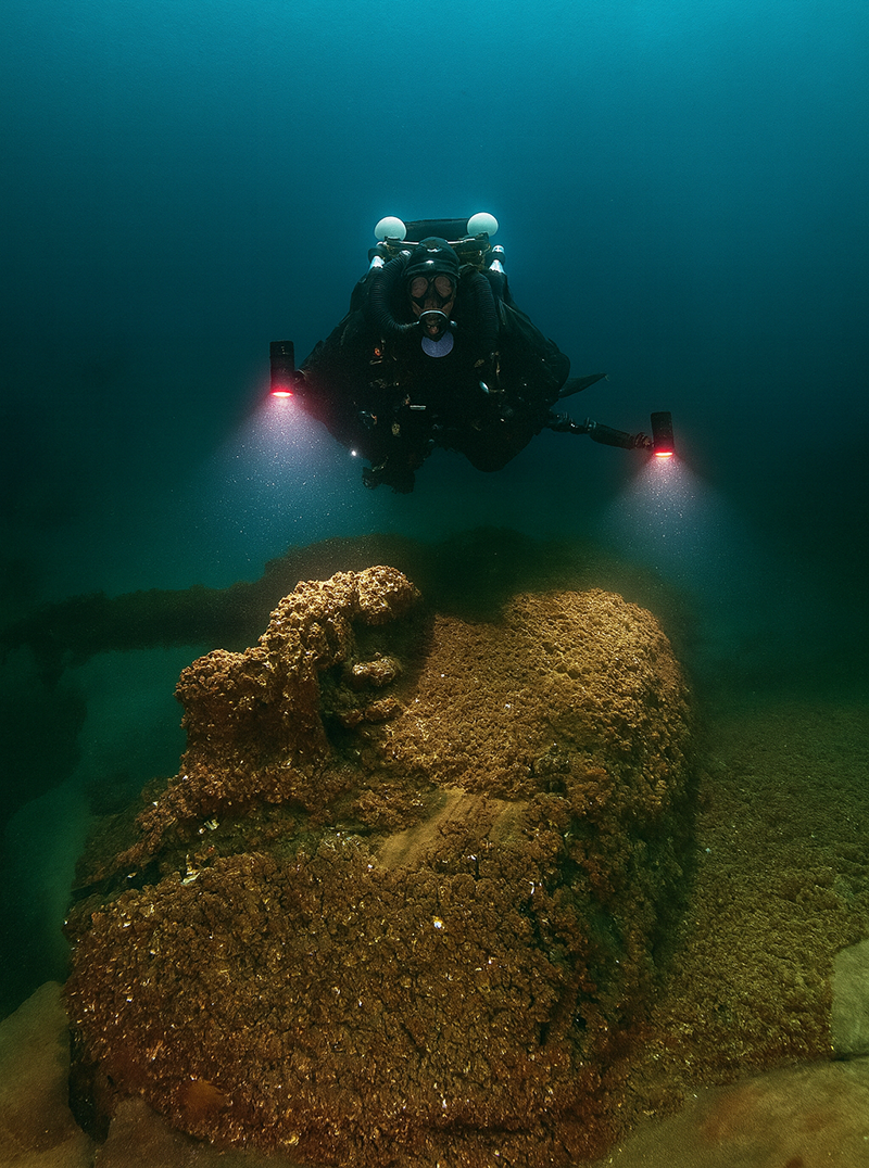 Above: Diver Michael Lynch lighting up the motorized workboat just off the stern of the James Carruthers on the floor of Lake Huron.