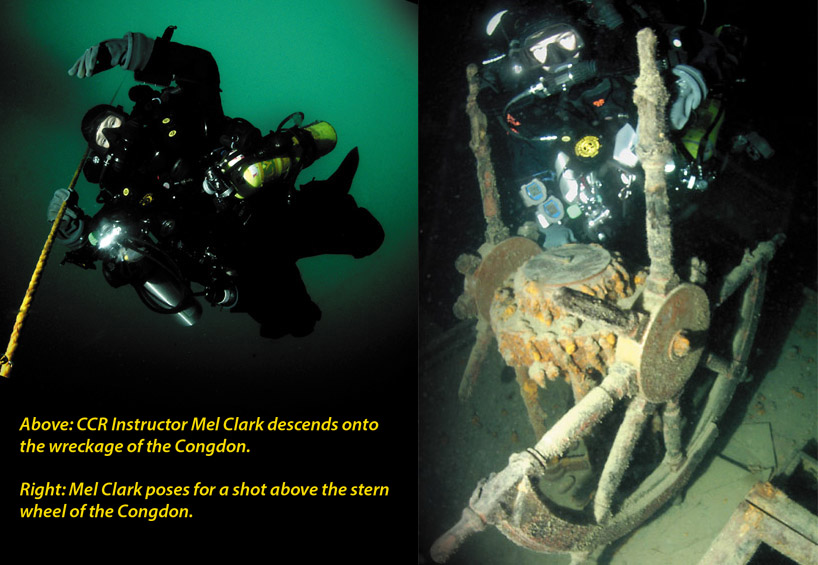 | Above: Ron Benson, CCR Dive Instructor and owner of Going Under Dive Center, descends the Kamloops bow mooring buoy line. |