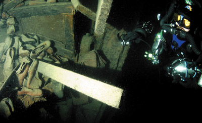 Swimming along the rocky bottom, away from the starboard stern, at 185 feet you can locate the evidence of loss of life on the wreckage. Human long bones and a lone shoe lie silent on the lake floor.