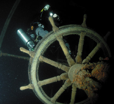 Since this would be my first cold water dive in the northwest of Lake Superior, Ron thought it would be best to break me in by doing a somewhat shallow dive on the Kamloops stern. Suiting up in my extra warm Weezle Extreme Plus undergarment, Dive Rite’s 905 drysuit, extra thick hood and a pair of wet gloves, I donned my KISS classic rebreather, a 40 cubic foot stage of oxygen, and an aluminum 80 air for emergency bailout. Standing on the dive platform with Mel Clark, Ron handed me my underwater camera housing and strobes; and with a giant stride step backwards, we entered the water. Brisk, was my first thought about the 50 degree water. But not so bad, I said to myself as we swam to the descent line. Dumping the air from my wings, I followed the 1-inch polypropylene stern ascent line as it dropped straight into the darkness below. |