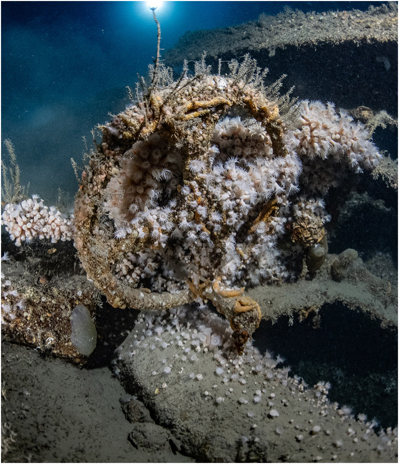 With only the late slack tide remaining, the crew prepared for a long and uncertain day. The 70-nm transit took four hours, but once on site, the excitement was palpable. The massive outline of Marmora appeared clearly on sonar. Calm surface conditions and clear prep made for a smooth drop.