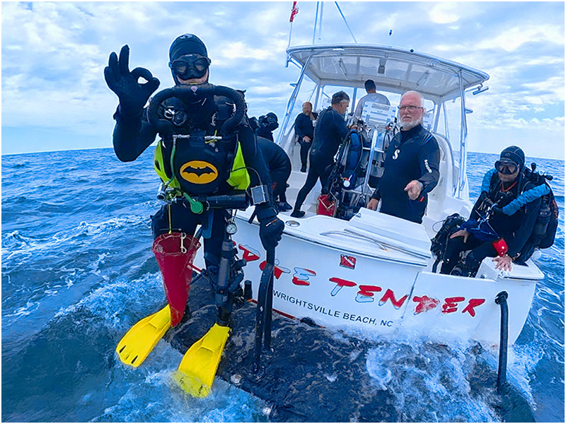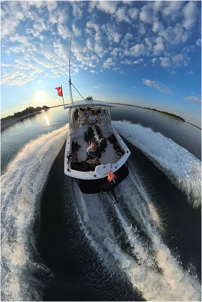Pulling into the marina, CCR divers Jon Lillestolen and Chris Williams are already there shuttling equipment down to the dock as we wait for the boat to arrive. 5:59am, right on time, the dive boat swings onto the dock. Two spry young men quickly cleat the boat and introduce themselves as Captain Chris Slog and Captain Brett Garner. I always say, “There’s nothing better than a boat with two captains!” Captain Slog informs us that the winds are expected to pick up in the afternoon, so we need to get offshore as quickly as possible, hoping to get our 3 dives in before the winds start. With twin 450hp Cummins diesel engines, the 36-foot, 13.5 beam Seatek planes out at 18 to 22 knots, ensuring a comfortable, quick two-hour, 40-mile run offshore into 100+ feet of water.
