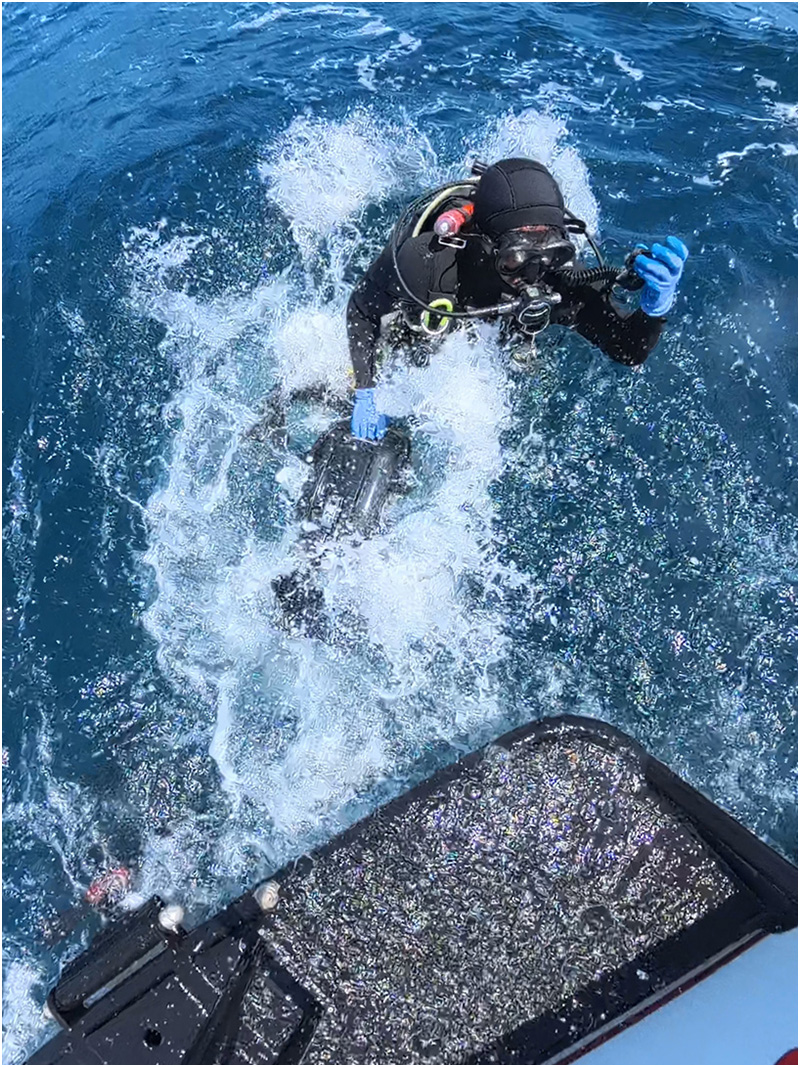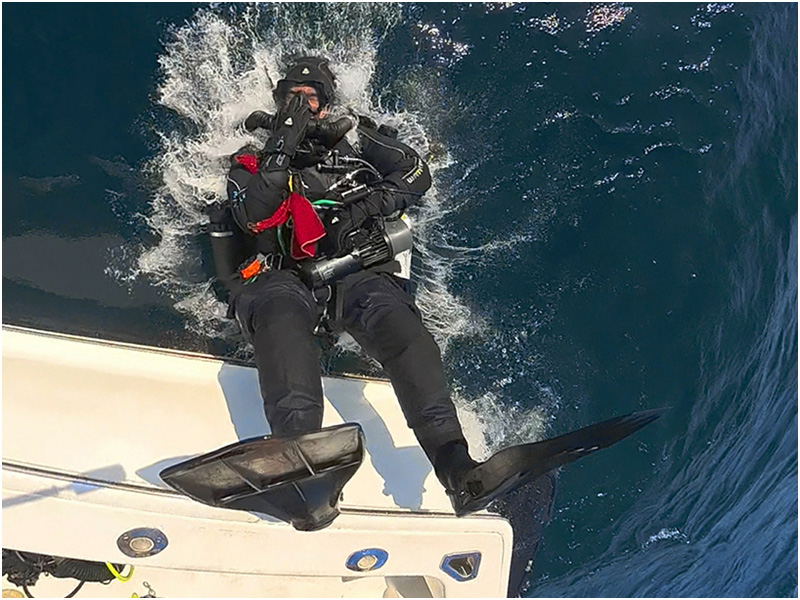 Above: Diver Fernando Gutierrez back roles off the boat breathing from his KISS Sidewinder rebreather.