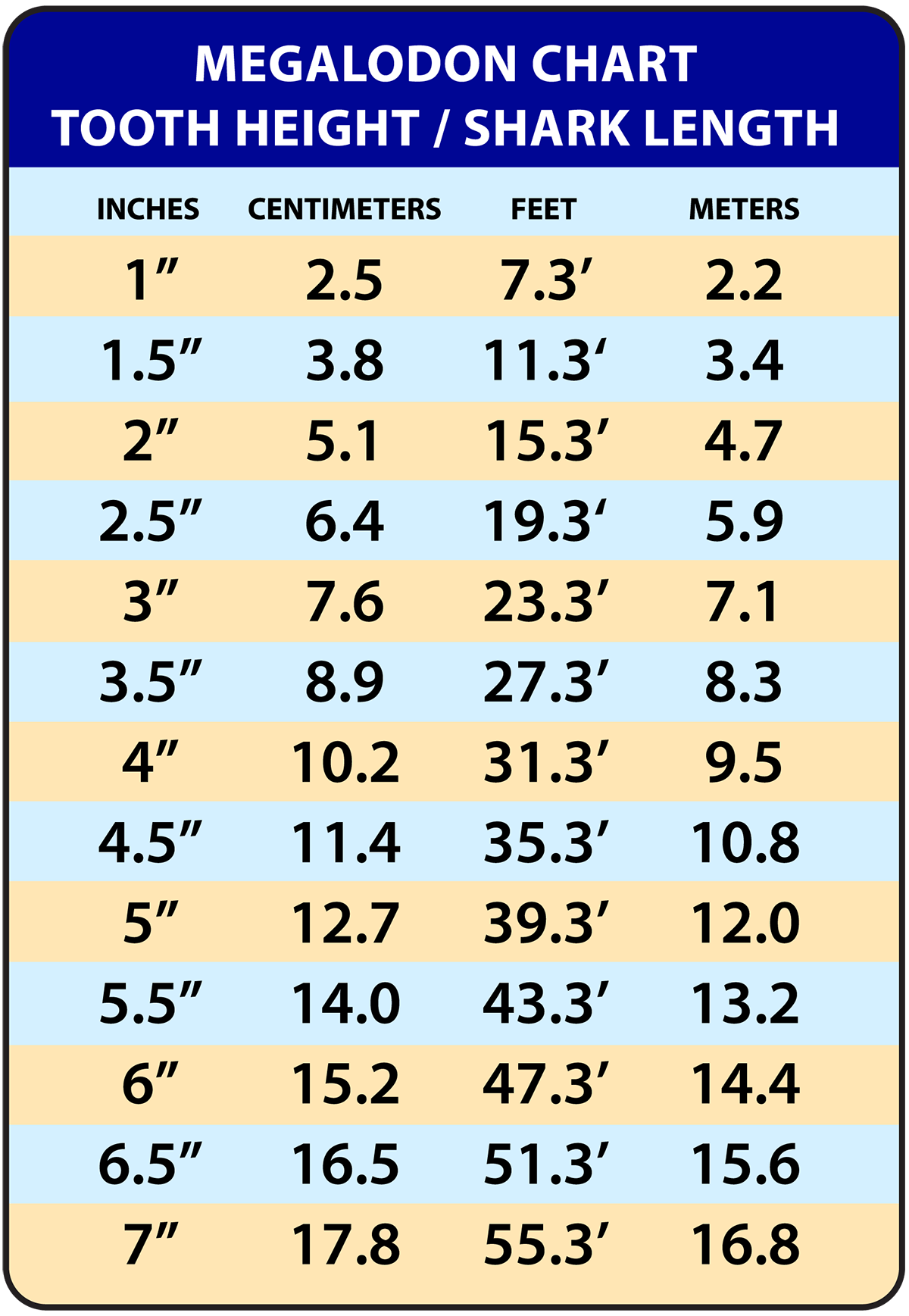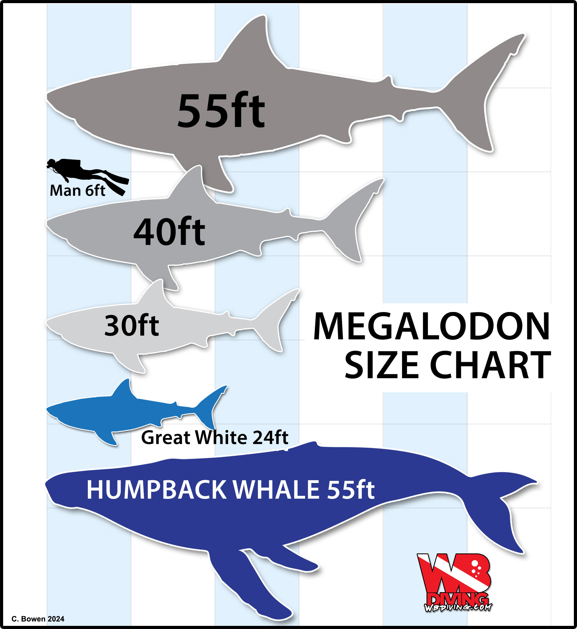In the present day, the Great White species of shark holds the title of the largest ocean predator, an awe-inspiring creature that demands reverence, exerting its authority over the vast expanse of oceans and seas. A Great White can reach lengths of over 20ft and a weight exceeding 2,400 pounds. Incredibly, a different species of shark reigned supreme in the world’s oceans a mere 3.5 million years ago. The Megalodon (Meg), was a colossal creature whose size far exceeded that of today’s Great White sharks. By examining the size of the largest Meg teeth recovered, scientists can estimate that this tremendous shark could have exceeded 50ft in length and weighed more than 50 tons. (see size chart below)