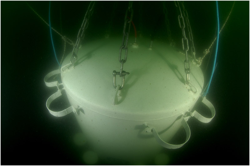 On the 9th, the pontoon was towed to the location of the wreck. The wreck had been located the day before by the fire department and a shot line has been put into place. With the help of the ROV, the shot was placed 30 centimeters from the wreck. Next to the shot a deco station was put into the water, which started at 80 meters. On the deco station also the bailout gas was staged. I made a quick dive to 60 meters along the shot to test my descent speed, check the visibility and the water temperature. The tests of the bell showed the bell was working perfectly.